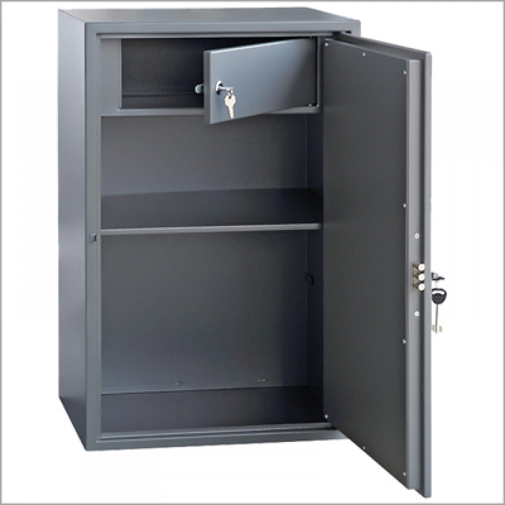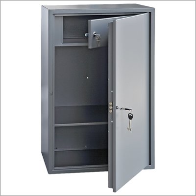 Внутри шкафа находится регулируемая по высоте полка и кассовая ячейка (трейзер). Толщина двери и корпуса в базовом исполнении равна 1,2 мм, но может варьироваться от 1,2 до 3 мм в зависимости от требований и технического задания заказчика. Дверь оборудована опечатывающим устройством.