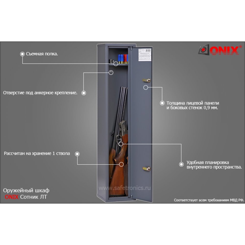 - Данная модель сейфа соответствует всем требованиям Министерства внутренних дел к хранению гражданского и служебного оружия, правилам его оборота, а также нормам оборота боеприпасов к оружию.