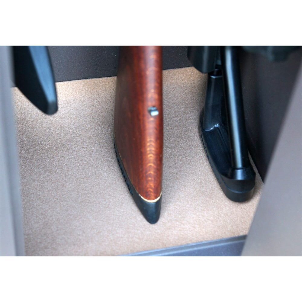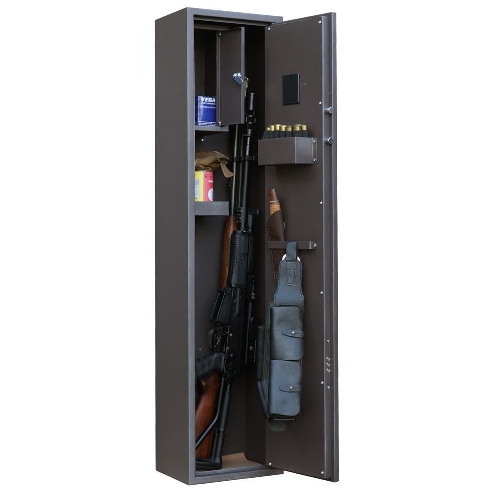Металлический оружейный шкаф с комбинацией электронного замка и сувальдного замка повышенной секретности с тремя ригелями позволяет хранить до двух ружей с дополнительными аксессуарами. Электронный замок с подсветкой дисплея имеет возможность программирования двух кодов пользователя. Работает от 4 батареек типа АА. Вы можете запирать оружейный шкаф только на электронный замок, и, если необходимо, дополнительно запирать на нижний ключевой замок.