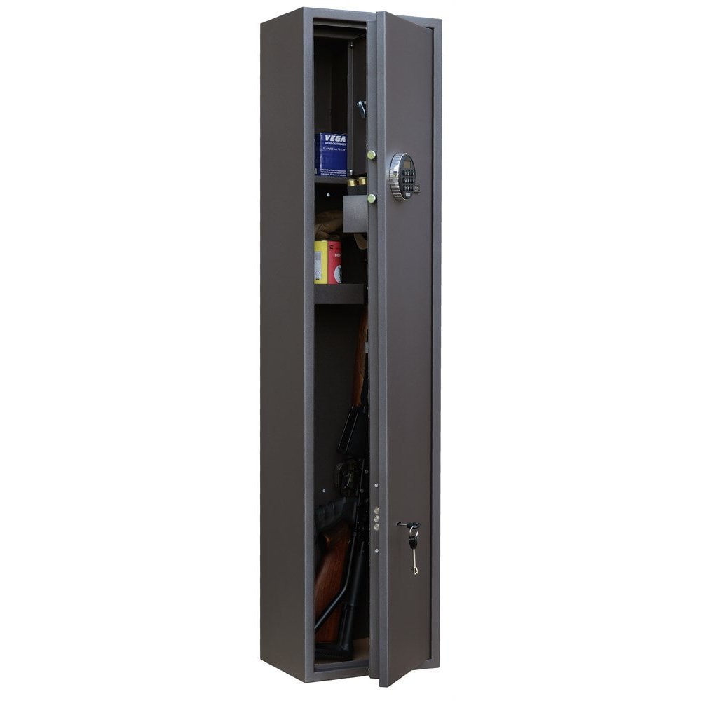Оружейный шкаф имеет запираемый на ключ встроенный ящик под патроны, съемный карман для аксессуаров, сварную полку, а также скобу для инвентаря. Предусмотрены отверстия для крепления к полу и стене. Шкаф укомплектован съемными резиновыми держателями, что позволяет крепко зафиксировать ствол ружья исключая смещение оружия внутри шкафа. Мягкий коврик позволит аккуратно и бережно устанавливать ружье без риска повредить приклад. Дверь усилена металлическим коробом, который не только закрывает замки, но и обеспечивает дополнительную жесткость конструкции. Максимальная длина оружия, размещаемого в сейфе - 1290 мм. Высота от пола до трейзера - 800 мм. Шкаф покрашен износостойкой порошковой краской.