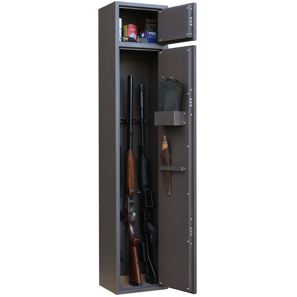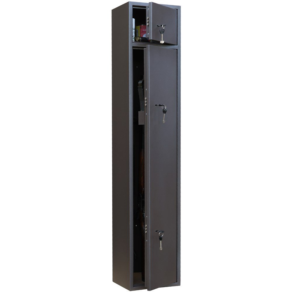 Металлический оружейный шкаф оснащен двумя надежными сувальдными замками повышенной секретности с тремя ригелями. Сейф позволяет хранить до трех ружей с дополнительными аксессуарами. Особенностью шкафа является независимое запираемое отделение с ключевым сувальдным замком, съемный карман для аксессуаров и сварная скоба для инвентаря. Предусмотрены отверстия для крепления к полу и стене. Шкаф укомплектован съемными резиновыми держателями, что позволяет крепко зафиксировать ствол ружья исключая смещение оружия внутри шкафа. Мягкий коврик позволит аккуратно и бережно устанавливать ружье без риска повредить приклад. Дверь усилена металлическим коробом, который не только закрывает замки, но и обеспечивает дополнительную жесткость конструкции, а так же позволяет перевешивать дверь справа налево. Максимальная длина оружия, размещаемого в сейфе - 1260 мм. Шкаф покрашен износостойкой порошковой краской.