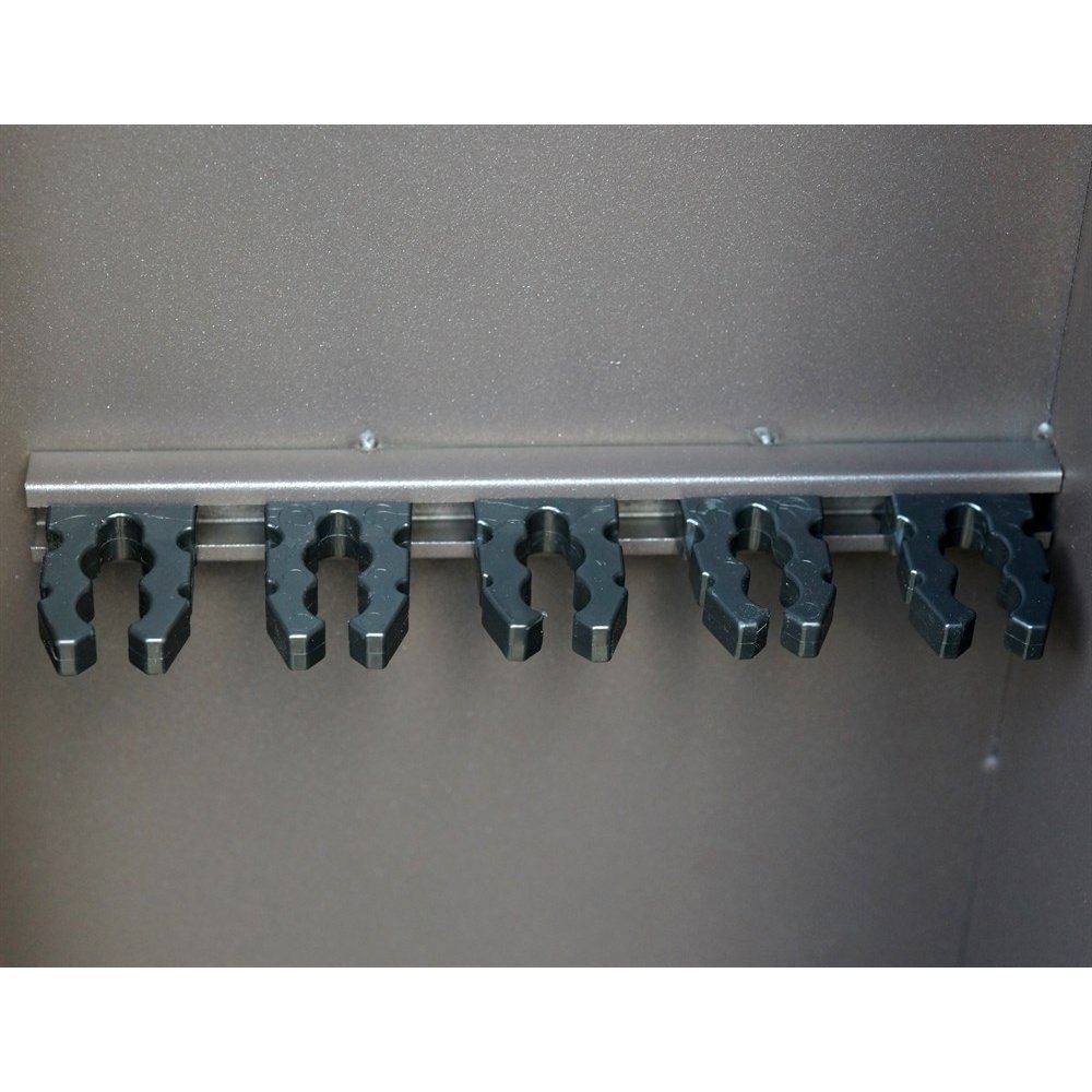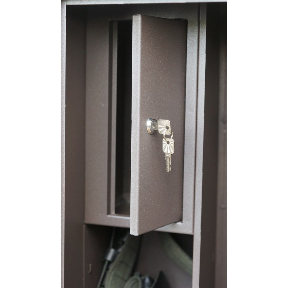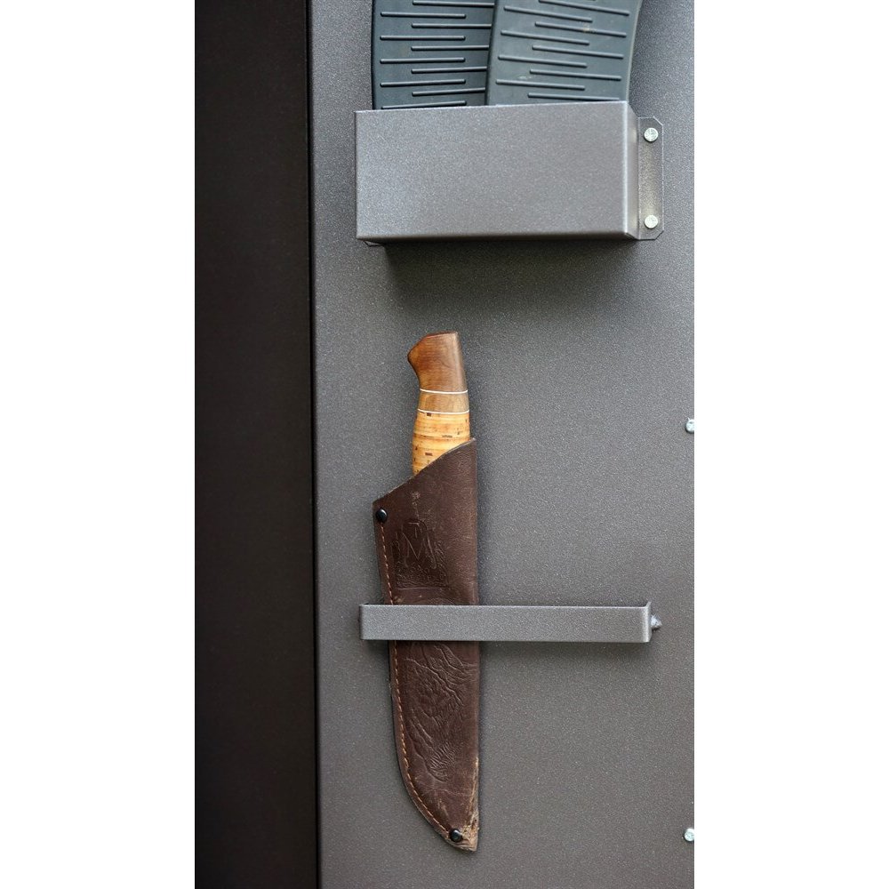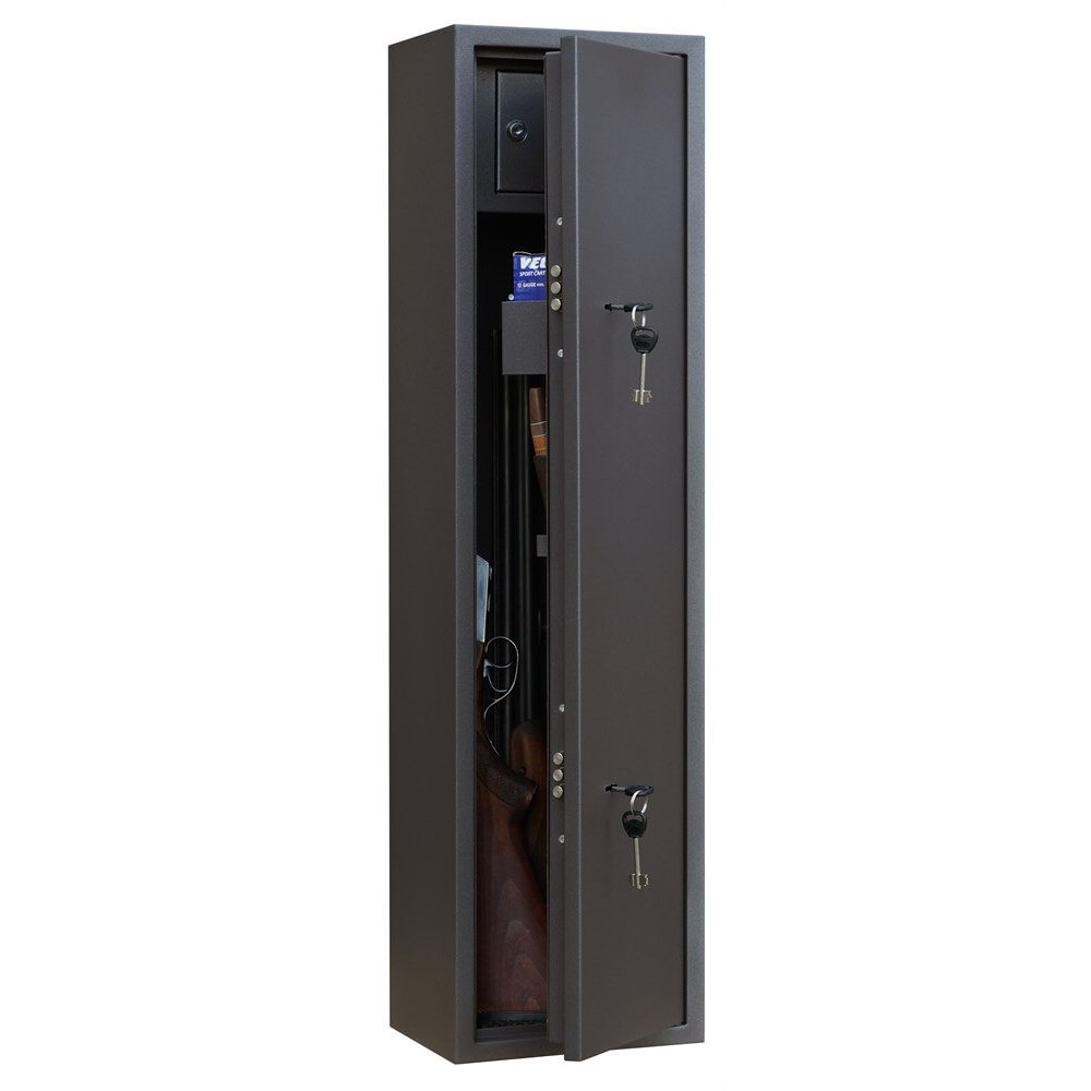 Металлический оружейный шкаф с комбинацией электронного замка и сувальдного замка повышенной секретности с тремя ригелями – идеальный вариант хранения до пяти ружей с дополнительными аксессуарами. Электронный замок с подсветкой дисплея имеет возможность программирования двух кодов пользователя. Работает от 4 батареек типа АА. Вы можете запирать оружейный шкаф только на электронный замок, а в случае необходимости дополнительной защиты, запирать на нижний ключевой замок. Сейф имеет запираемый на ключ встроенный ящик под патроны, съемный карман для аксессуаров, сварную скобу для инвентаря. Оружейный шкаф разделен сварной перегородкой. В левой части шкафа отделение с регулируемыми по высоте съемными полками. В правой части шкафа пространство для хранения ружей. Предусмотрены отверстия для крепления к полу и стене. Шкаф укомплектован съемными резиновыми держателями, что позволяет крепко зафиксировать ствол ружья исключая смещение оружия внутри шкафа. Мягкий коврик позволит аккуратно и бережно устанавливать ружье без риска повредить приклад. Дверь усилена металлическим коробом, который не только закрывает замки, но и обеспечивает дополнительную жесткость конструкции. Максимальная длина оружия, размещаемого в сейфе - 1395 мм. Высота от пола до трейзера - 1100 мм. Шкаф покрашен износостойкой порошковой краской.
