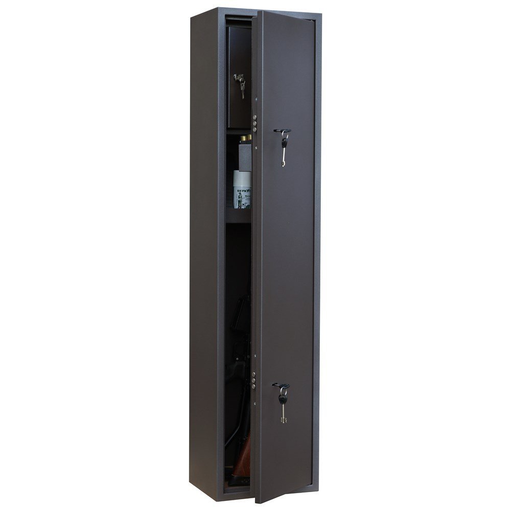 Металлический оружейный шкаф оснащен двумя надежными сувальдными замками повышенной секретности с тремя ригелями. Сейф позволяет хранить до двух ружей с дополнительными аксессуарами и имеет запираемый на ключ встроенный ящик под патроны, съемный карман для аксессуаров, сварную полку, а также скобу для инвентаря. Предусмотрены отверстия для крепления к полу и стене. Шкаф укомплектован съемными резиновыми держателями, что позволяет крепко зафиксировать ствол ружья исключая смещение оружия внутри шкафа. Мягкий коврик позволит аккуратно и бережно устанавливать ружье без риска повредить приклад. Дверь усилена металлическим коробом, который не только закрывает замки, но и обеспечивает дополнительную жесткость конструкции, а так же позволяет перевешивать дверь справа налево. Максимальная длина оружия, размещаемого в сейфе -1290 мм. Высота от пола до трейзера - 800 мм. Шкаф покрашен износостойкой порошковой краской.