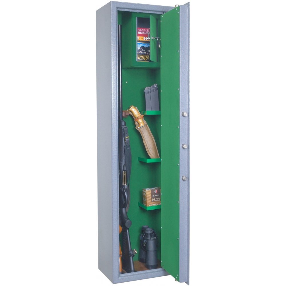 Сейф односекционный, на 2 ствола оснащен съемными полками и отделением под патроны. Ложементы — дерево. В двери установлен немецкий ключевой 8-ми сувальдный замок Mauer с ригельной системой запирания в 3 стороны. Диаметр ригеля 20 мм. Второй замок ЗАО "Про-Сам" г. Рязань или аналогичный замок другого производителя.