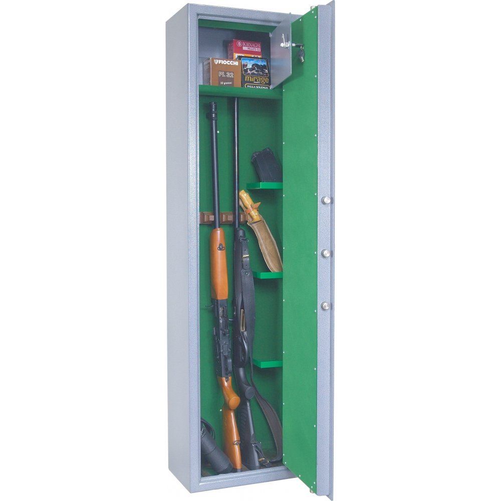 Сейф односекционный, на 4 ствола оснащен съемными полками и отделением под патроны. Ложементы — дерево. В двери установлен немецкий ключевой 8-ми сувальдный замок Mauer с ригельной системой запирания в 3 стороны. Диаметр ригеля 20 мм. Второй замок ЗАО "Про-Сам" г. Рязань или аналогичный замок другого производителя.