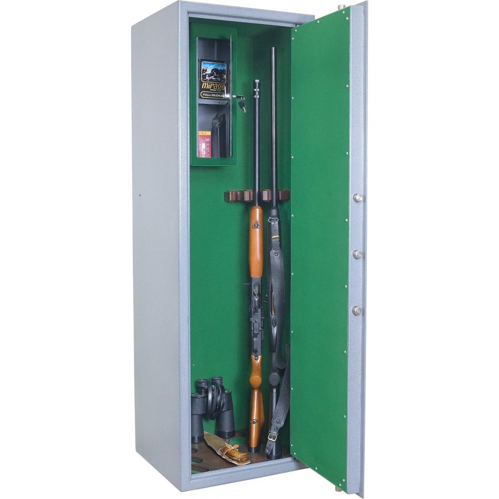 Сейф односекционный, на 6 стволов оснащен отделением под патроны. Ложементы — дерево. В двери установлен немецкий ключевой 8-ми сувальдный замок Mauer с ригельной системой запирания в 3 стороны. Диаметр ригеля 20 мм. Второй замок ЗАО "Про-Сам" г. Рязань или аналогичный замок другого производителя.