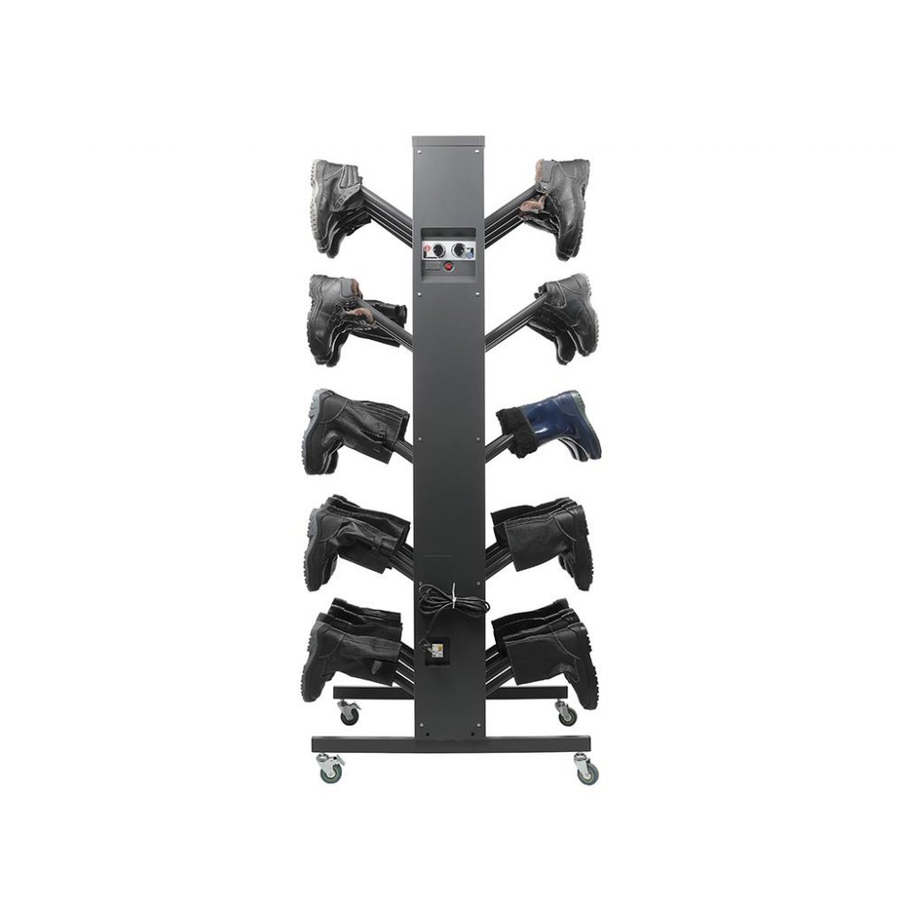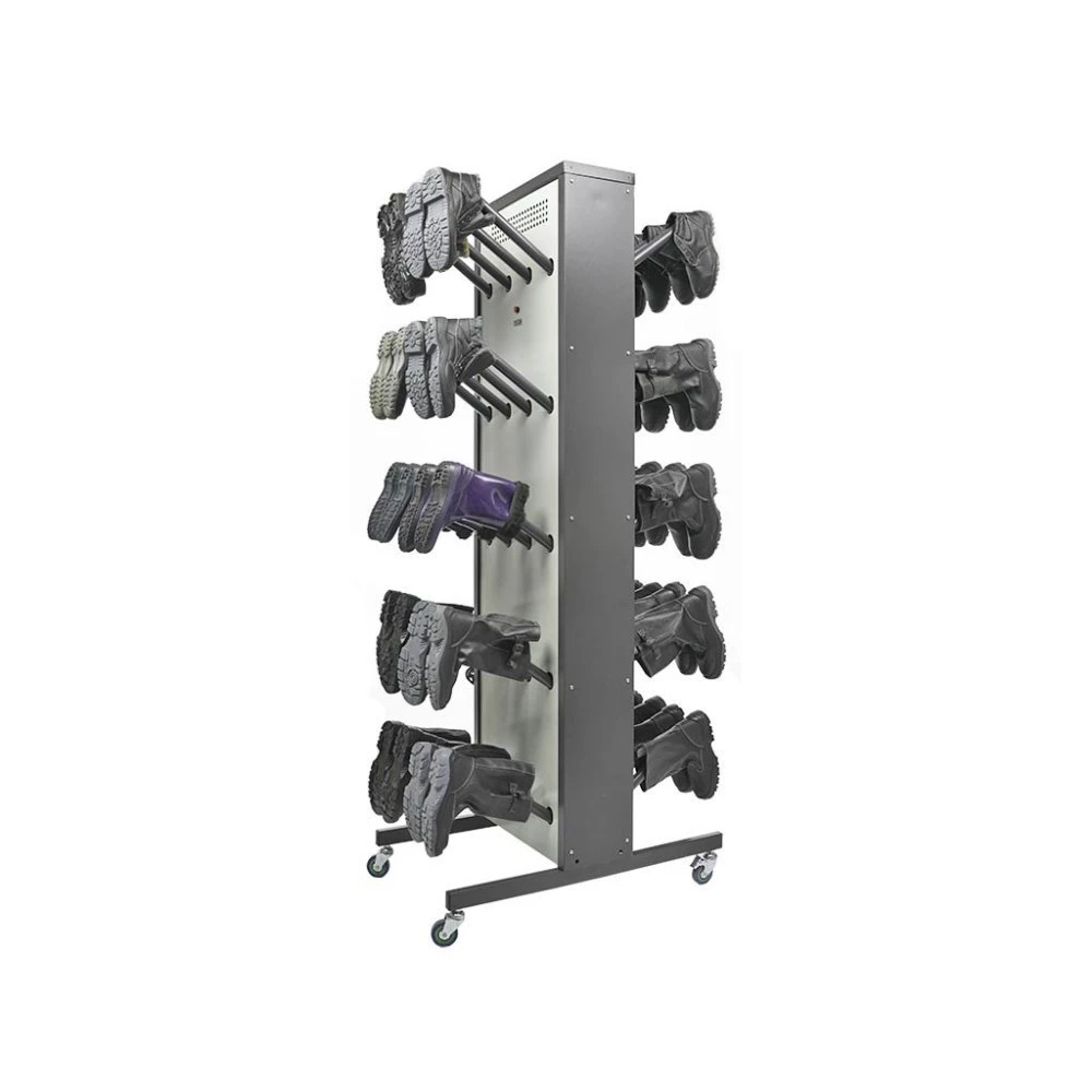 Принцип работы заключается в нагнетании теплого воздуха внутрь обуви через патрубки. Влажная обувь навешивается на расположенные на корпусе стойки кронштейны, через которые подается теплый воздух. Таким образом, конвекция воздуха происходит непосредственно во внутренней части ботинка, что существенно ускоряет процесс сушки. Каждый патрубок для обуви снабжен инерционным клапаном, перекрывает подачу воздуха, если ботинок не одет.