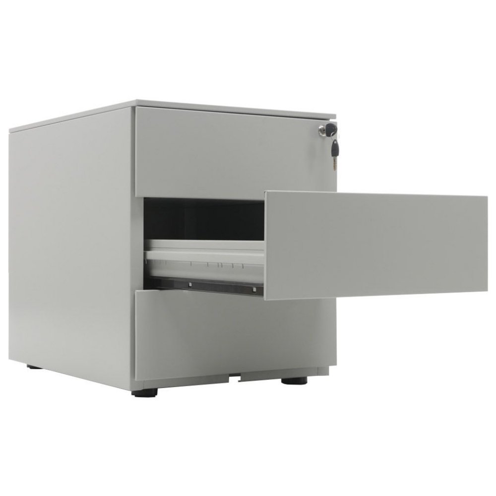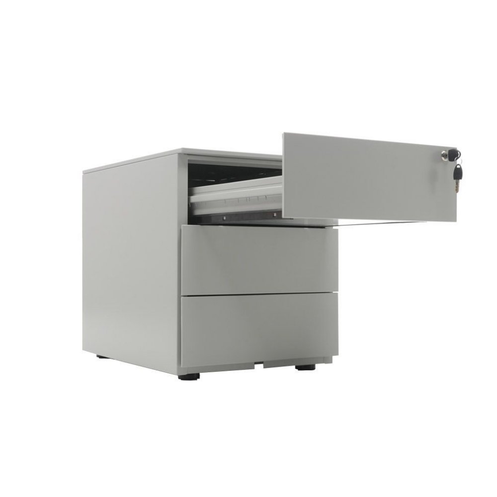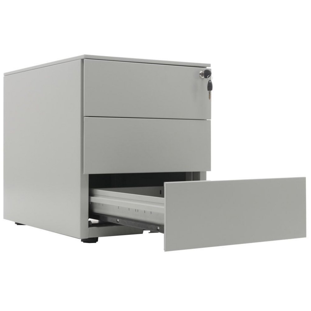 - Опции: пластиковые лотки и металлический ящик для канцелярских принадлежностей и других предметов. Возможность комбинирования цветов: корпус + фасады ящиков и крышка (конструкция тумбы металл+металл). Или отделка фасадов ящиков и крыши тумбы ламинированной плитой ЛДСП