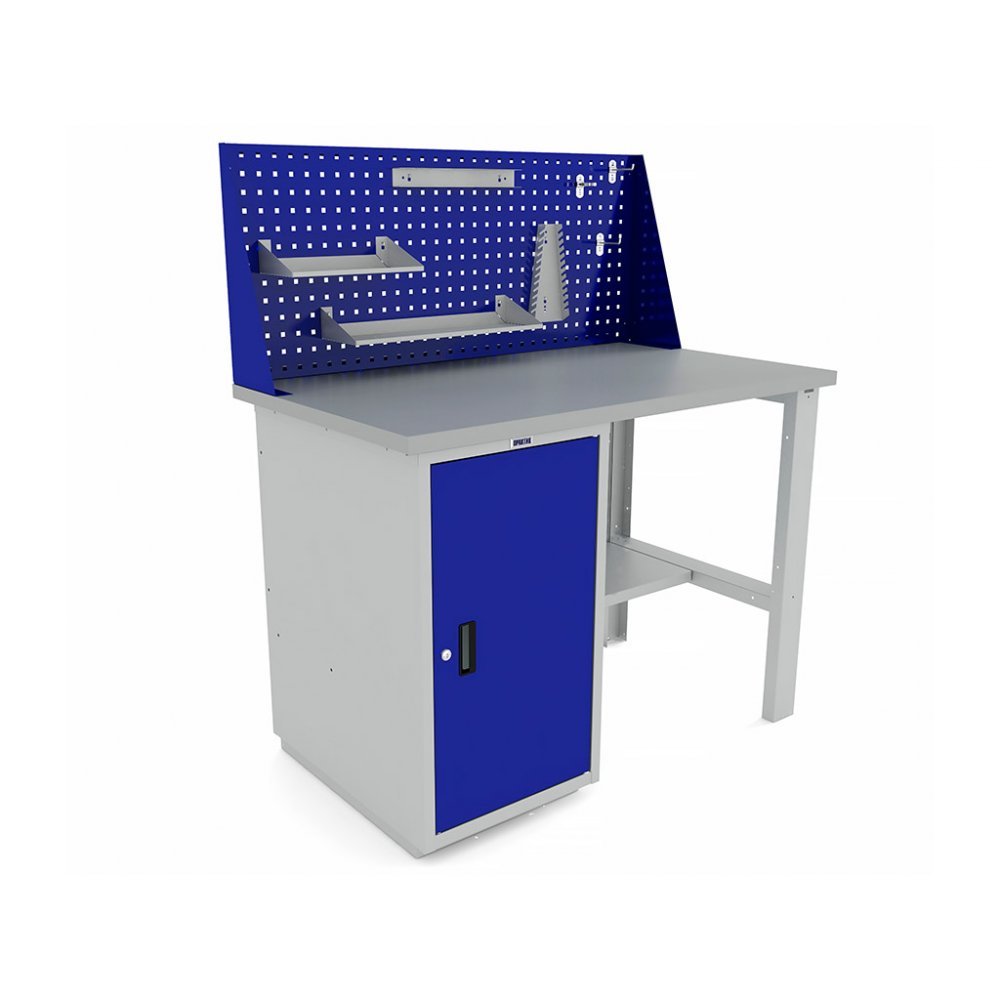 - Верстак окрашен порошковой краской, цвет покрытия корпуса серый шагрень (RAL 7038), лицевая панель дверцы тумбы – синий шагрень (RAL 5002)