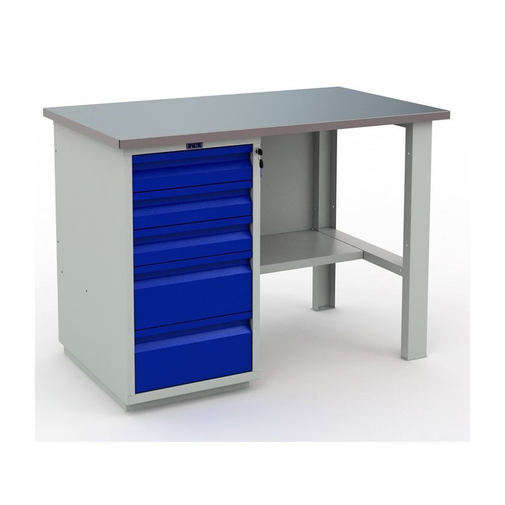 - Верстак окрашен порошковой краской, цвет покрытия корпуса серый шагрень (RAL 7038), лицевая панель дверцы тумбы – синий шагрень (RAL 5002)