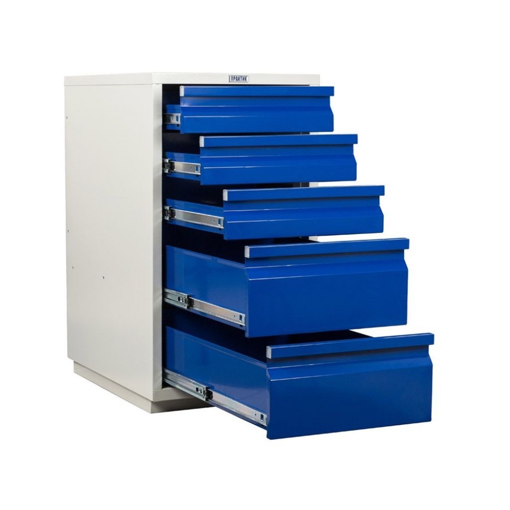 - Тумба укомплектована 5-ю выдвижными ящиками. Телескопические напрявляющие. Нагрузка на ящик 30 кг. Все ящики закрываются на центральный ключевой замок.