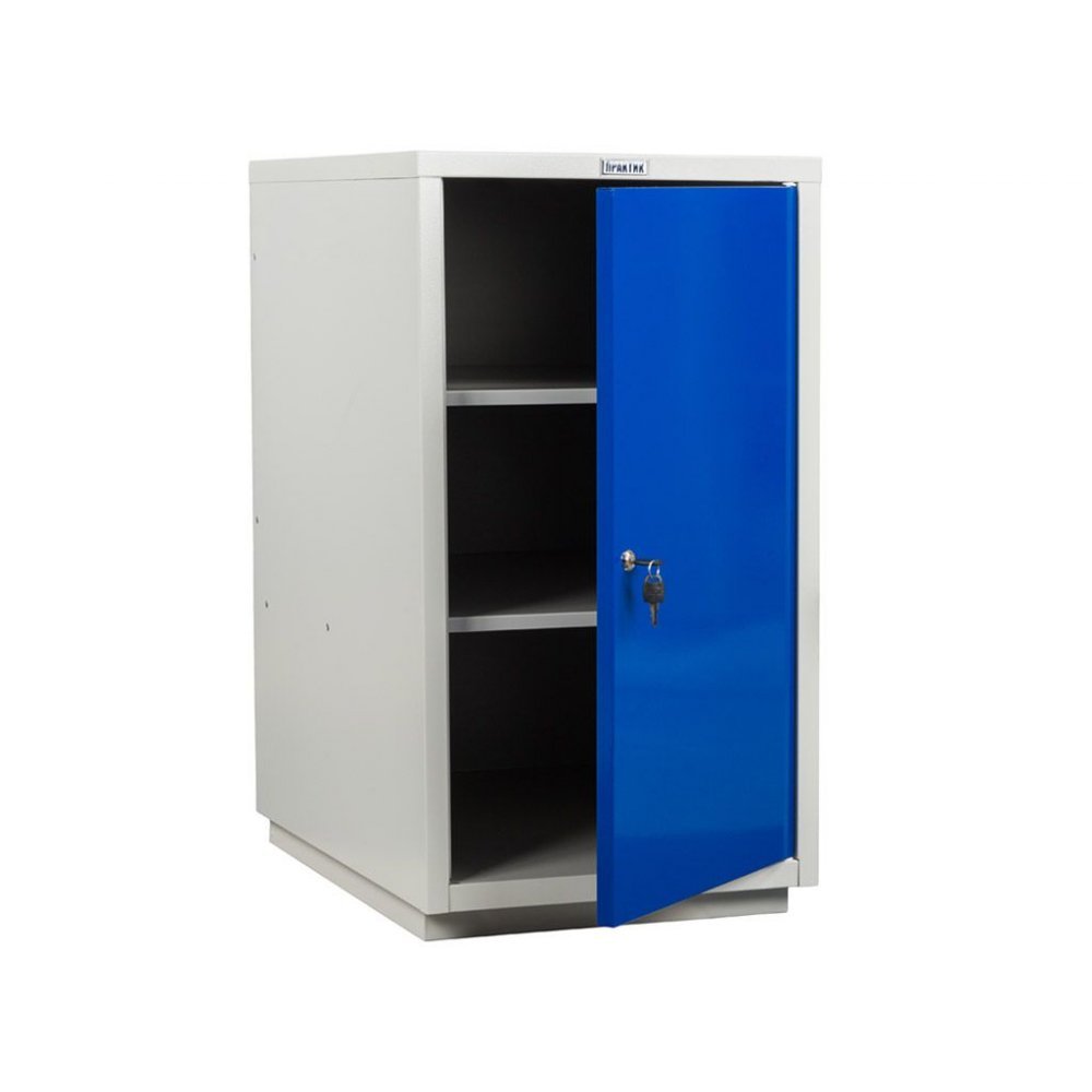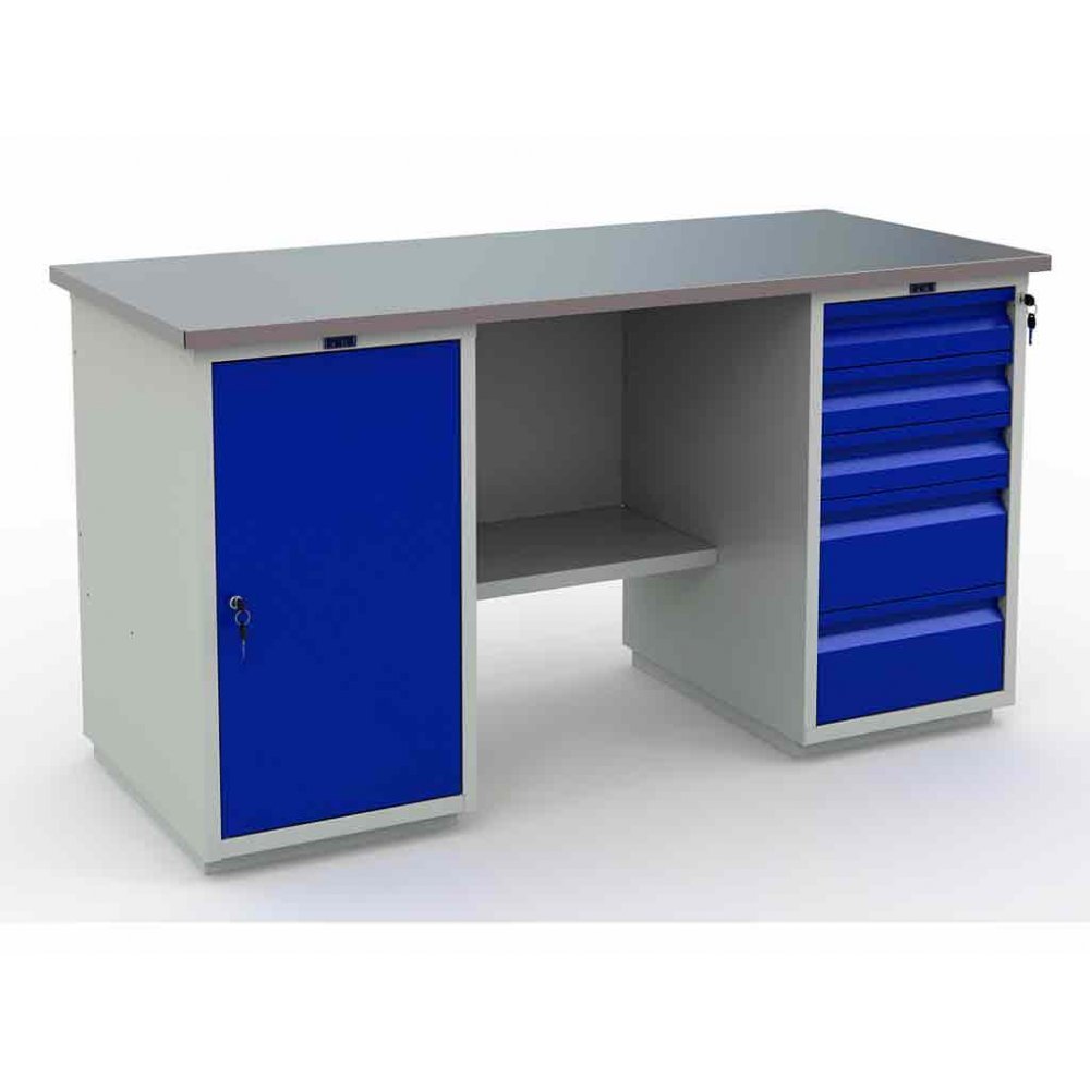 - Верстак окрашен порошковой краской, цвет покрытия корпуса серый шагрень (RAL 7038), лицевая панель дверцы тумбы – синий шагрень (RAL 5002)