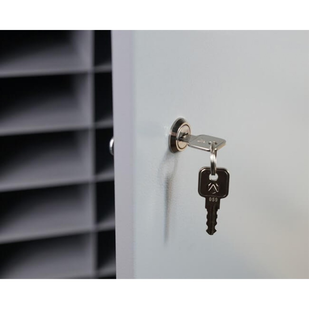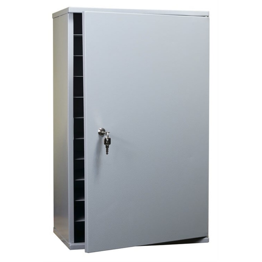 Металлический многосекционный шкаф для хранения сотовых телефонов или гаджетов в школах, государственных учреждениях или гостиницах. Цельносварной металлический корпус, ячейки с индивидуальными ключевыми замками. Внешние размеры шкафа (ВхШхГ) 705х400х250 мм. Внутренний размер ячейки хранения (ВхШхГ) 55х120х220 мм. Толщина металла 0,7-1 мм. Вес 12 кг.